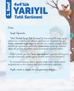 Önsöz Sevgili Öğrenciler, "Dört Dörtlük Yarıyıl Tatil Serüveni” ile karşınızdayız! Bu kitap, yarıyıl tatilinizi hem verimli hem de eğlenceli geçirmeniz için hazırlandı. Her gün; Türkçe, matematik, hayat bilgisi derslerinden kısa, anlaşılır ve keyifli tekrar etkinlikleriyle öğrenmenizi pekiştirirken, bilişsel beceri sorularıyla düşünme, dikkat, akıl yürütme ve problem çözme becerilerinizi güçlendireceksiniz. Kitabın sonunda yer alan "süreç değerlendirme” sayesinde tatil boyunca edindiğiniz kazanımları gözden geçirip kendinizi ölçme fırsatı bulacaksınız. Bu serüvende amacımız, sizlerin öğrenme isteğini canlı tutmak, tatilinizi zenginleştirmek ve ikinci döneme daha güçlü başlamanızı sağlamaktır. Keyifli, verimli ve dopdolu bir tatil geçirmeniz dileğiyle … 1. Sınıf