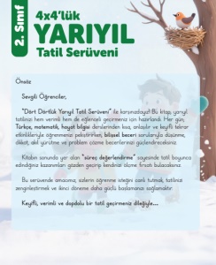 Önsöz Sevgili Öğrenciler, "Dört Dörtlük Yarıyıl Tatil Serüveni” ile karşınızdayız! Bu kitap, yarıyıl tatilinizi hem verimli hem de eğlenceli geçirmeniz için hazırlandı. Her gün; Türkçe, matematik, hayat bilgisi derslerinden kısa, anlaşılır ve keyifli tekrar etkinlikleriyle öğrenmenizi pekiştirirken, bilişsel beceri sorularıyla düşünme, dikkat, akıl yürütme ve problem çözme becerilerinizi güçlendireceksiniz. Kitabın sonunda yer alan "süreç değerlendirme” sayesinde tatil boyunca edindiğiniz kazanımları gözden geçirip kendinizi ölçme fırsatı bulacaksınız. Bu serüvende amacımız, sizlerin öğrenme isteğini canlı tutmak, tatilinizi zenginleştirmek ve ikinci döneme daha güçlü başlamanızı sağlamaktır. Keyifli, verimli ve dopdolu bir tatil geçirmeniz dileğiyle … 2. Sınıf