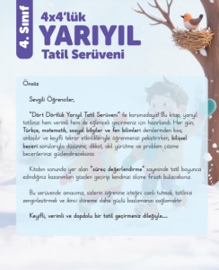 Önsöz Sevgili Öğrenciler, "Dört Dörtlük Yarıyıl Tatil Serüveni” ile karşınızdayız! Bu kitap, yarıyıl tatilinizi hem verimli hem de eğlenceli geçirmeniz için hazırlandı. Her gün; Türkçe, matematik, sosyal bilgiler ve fen bilimleri derslerinden kısa, anlaşılır ve keyifli tekrar etkinlikleriyle öğrenmenizi pekiştirirken, bilişsel beceri sorularıyla düşünme, dikkat, akıl yürütme ve problem çözme becerilerinizi güçlendireceksiniz. Kitabın sonunda yer alan "süreç değerlendirme” sayesinde tatil boyunca edindiğiniz kazanımları gözden geçirip kendinizi ölçme fırsatı bulacaksınız. Bu serüvende amacımız, sizlerin öğrenme isteğini canlı tutmak, tatilinizi zenginleştirmek ve ikinci döneme daha güçlü başlamanızı sağlamaktır. Keyifli, verimli ve dopdolu bir tatil geçirmeniz dileğiyle … 4. Sınıf