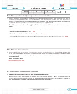 Ad-Soyad: Yazılı Hazırlık Kitabı TÜRKÇE Puan: 5. SINIF 1. DÖNEM 1. YAZILI 1 Soru No 1. 2. 3. 4. 5. Puan Değeri 20 20 20 20 20 T.0.5.5. Metinde geçen anlamını bilmediği söz varlığı unsurlarının anlamını tahmin edebilme 1. Ortalama büyüklükteki bir kakao ağacının yıl boyunca verdiği meyvelerden yaklaşık 2 kilogram kadar çikolata elde edilir. Uzay yol- culuklarında, çikolata gibi kalorisi yüksek, kolay paketlenebilen ve kırıntı oluşturmayacak yiyecekler tercih edilir. İlk çikolata, Rus kozmonot Yuri Gagarin’le birlikte 1961 yılında uzaya gönderilmiştir. Çikolatanın insan sağlığına bazı yararları olsa da çikolatayı fazla tükettiğimizde çikolatanın içeriğinde bulunan bir kimyasalın zehirlenmeye yol açtığı bilinmektedir. Bu metinde geçen bazı sözcüklerin anlamı aşağıda verilmiştir. Anlamı verilen sözcükleri metinden bularak anlamlarının karşısına yazınız. • Gök cisimleri de dâhil olmak üzere bütün varlıkların içinde bulunduğu sonsuz boşluk • Bir şeyden ayrılan küçük parça; parçacık, kırık • Ülkeden ülkeye veya bir ülke içinde bir yerden bir yere gidiş veya geliş • Bitkilerde çiçeğin döllenmesinden sonra yumurtalığın gelişmesiyle oluşan tohumları taşıyan, genellikle yenebilen kısım T.O.5.6 Metnin yüzey anlamını belirleyebilme 2. Dinozorlar, günümüzden çok uzun zaman önce yaşamışlardı. Bazı bilim insanları, dinozorların yok olmasına Dünya’ya çarpan büyük bir gök taşının neden olduğunu düşünüyorlar. Bu çarpma sonucunda gökyüzü bir toz bulutuyla kaplanmıştı. Bu toz bulutu uzun bir süre Güneş ışığının yeryüzüne ulaşmasını engellemişti. Bu durum, dinozorların besin kaynaklarının azalmasına ve sonunda da yok olmalarına yol açmıştı. Metnin konusu nedir? Yazınız. T.0.5.21.Yazım kuralları ve noktalama işaretlerini uygulayabilme 3. Aşağıda verilen metinde yay ayraçların içine uygun noktalama işaretlerini getiriniz. Braille ( ) okuma yazmayı görme engelliler için geliştirilen önceki harf yöntemiyle öğrenmişti ( ) Bunun zorluklarını biliyordu ( ) Bu yöntemle harfleri tanımak zor oluyordu ( ) yazılan yazı da sayfada çok yer kaplıyordu. Bu nedenle görme engellilerin okuyacağı pek fazla kitap basılmıyordu ( ) Braille ise daha fazla kitap okuma isteğiyle yanıp tutuşuyordu ( ) Uzay Yolculuk Dinozorların azalıp yok olma sebebi . . . . , . Meyve Kırıntı